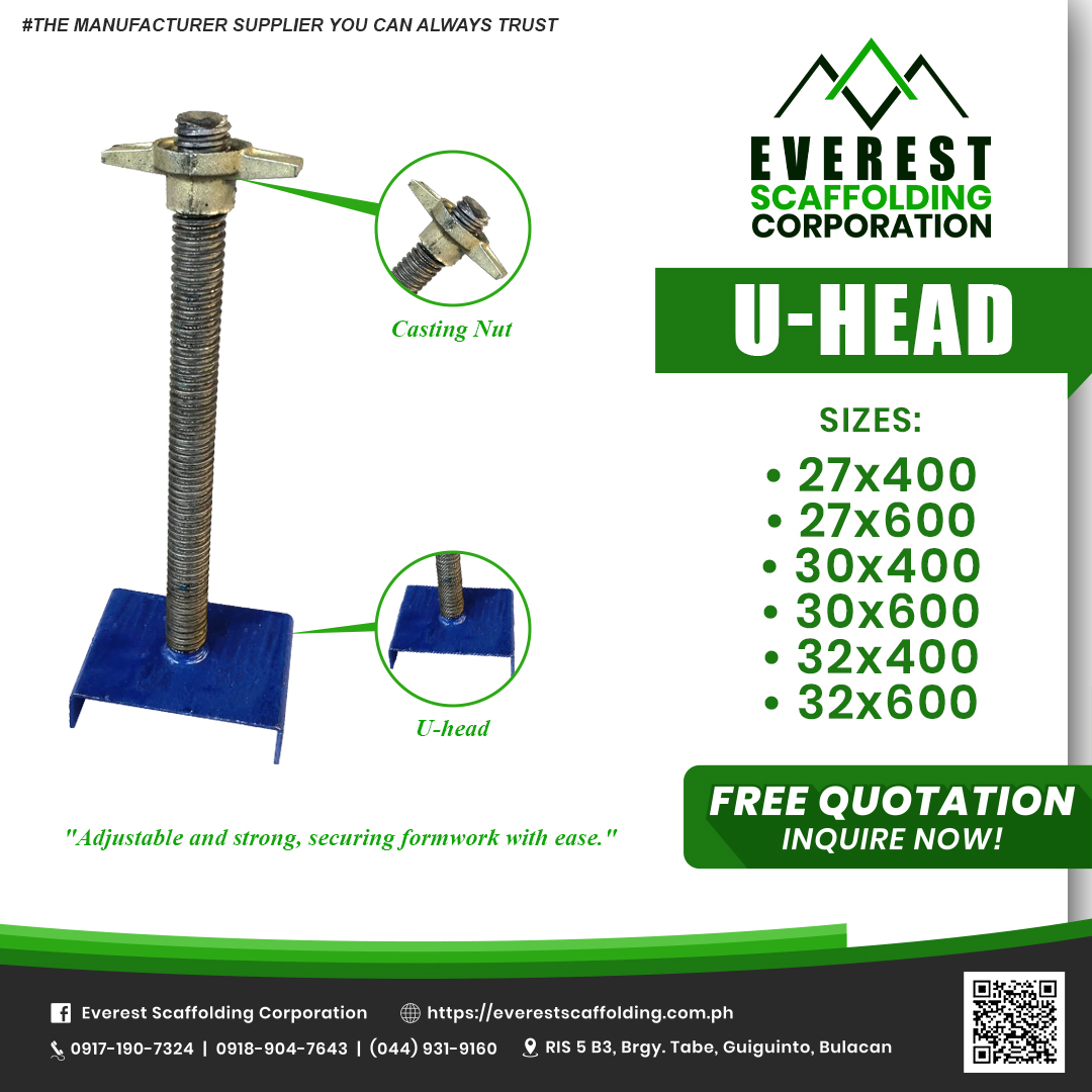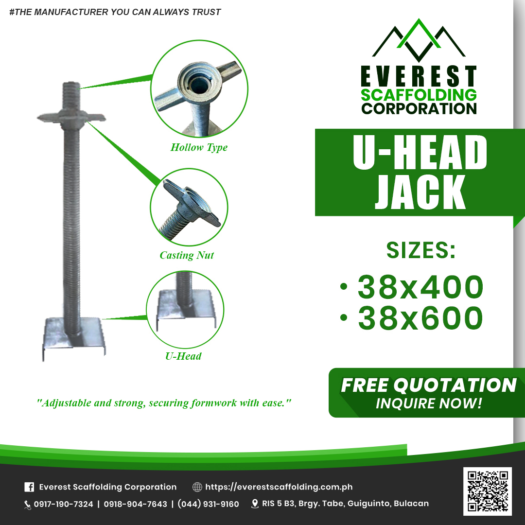 U-head jack is a scaffolding support and leveling component with a U-shaped top head, used to hold and secure horizontal members such as beams, girders, or timber.