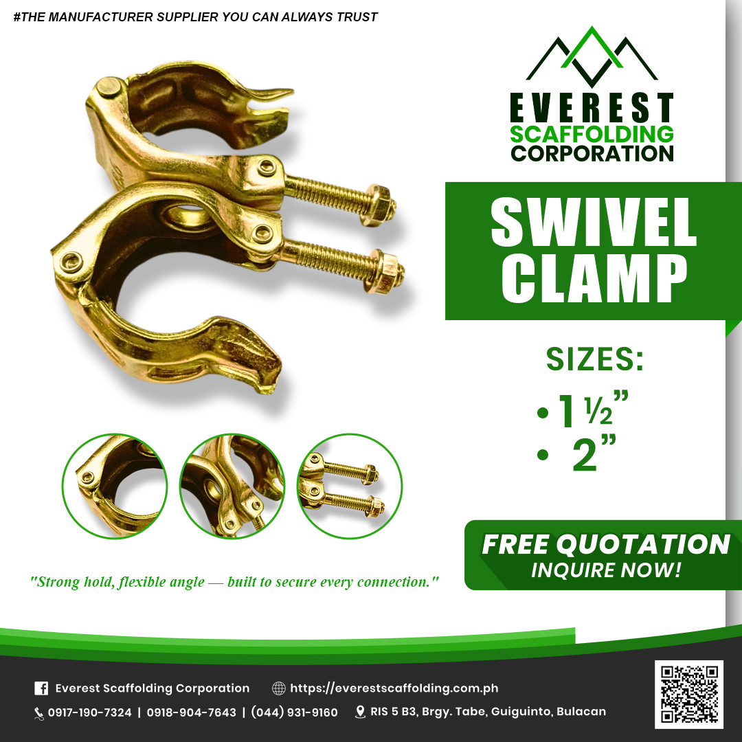 Swivel clamp is a scaffolding coupler used to connect two scaffold tubes or pipes at any adjustable angle, allowing the pipes to rotate relative to each other before tightening.