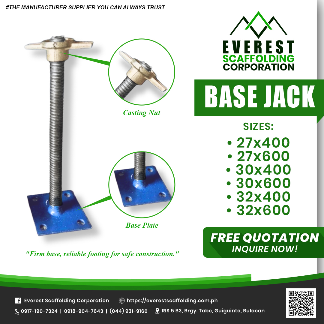 Base jack is a scaffolding leveling and support component installed at the bottom of vertical scaffold standards to provide a stable base and allow height adjustment for proper alignment