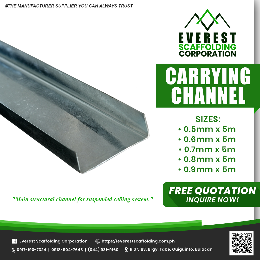 Carrying channel is a main structural steel or galvanized channel used as the primary support member in ceiling suspension and light framing systems, designed to carry the load of secondary framing members such as furring channels or metal studs.