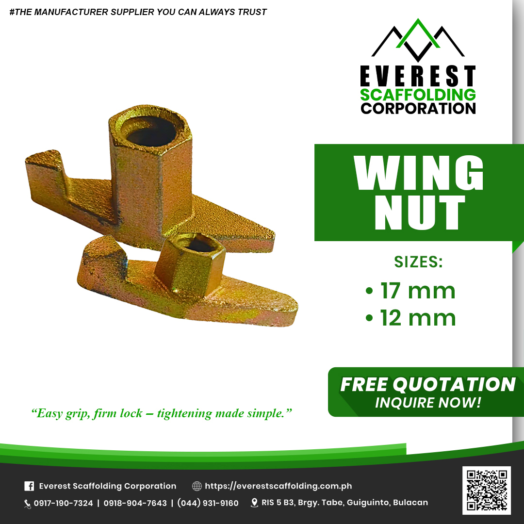 Wing nut is a heavy-duty wing-shaped nut specifically designed to fasten onto a threaded tie rod. It is used to tighten, lock, and secure form panels or scaffold support members quickly by hand.