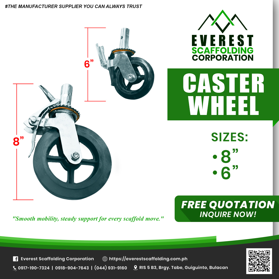 Caster Wheels are heavy-duty wheels attached to the base of mobile scaffolds, allowing easy movement while maintaining safety with locking mechanisms.
