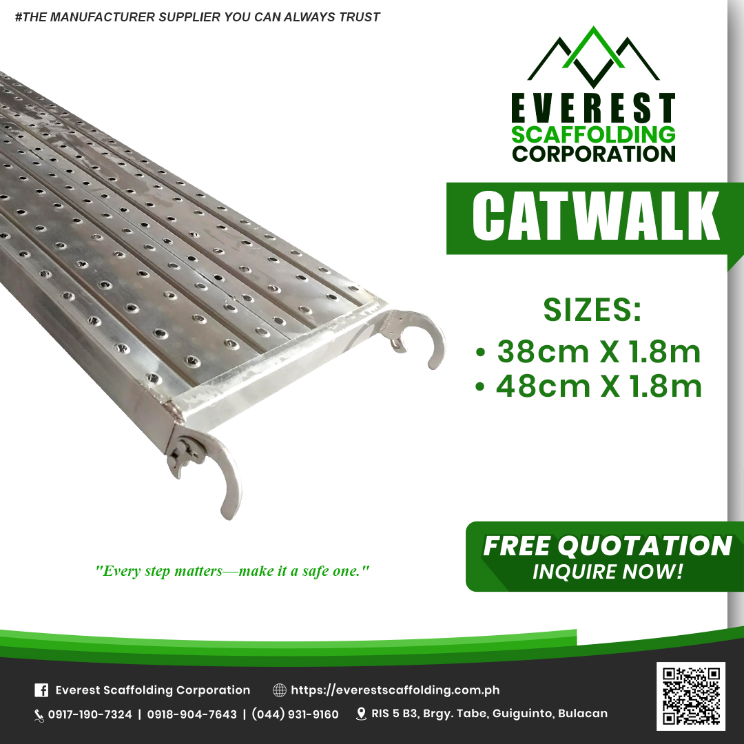 Catwalks are steel platforms with hook placed on scaffolding frames, providing workers with a safe and stable walkway for standing, moving, and carrying materials at elevated heights.